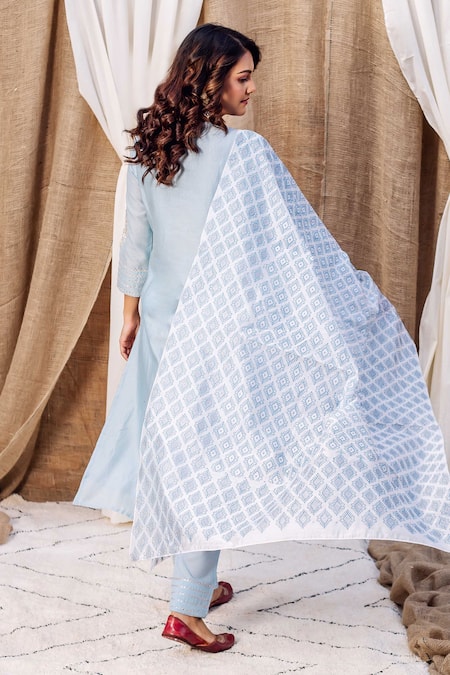 Blue kurta featuring hand embroidery and gota trim details. Paired with cotton pants and a hand block print dupatta.