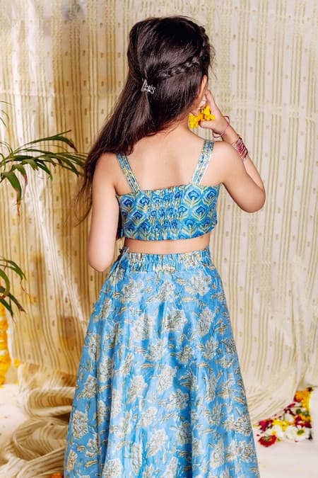 Blue lehenga featuring botanical handblock print with a ruched back. Paired with a matching blouse and shaded organza dupatta.