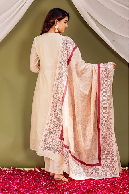 Beige kurta featuring floral thread embroidery on the yoke. Paired with a matching pant and hand block printed dupatta.