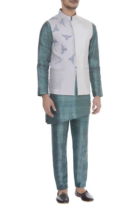 Buy_Mitesh Lodha_White Raw Silk Printed Mandarin Collar Bundi_at_Aza_Fashions