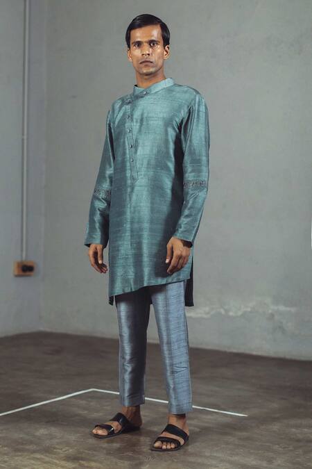Grey kurta with overlap & cross button placket, embroidered sleeves & asymmetric hem.