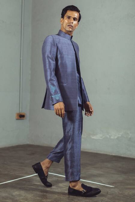 Grey front-open bandhgala with mandarin collar, floral embroidered sleeves, welt & patch pocket.