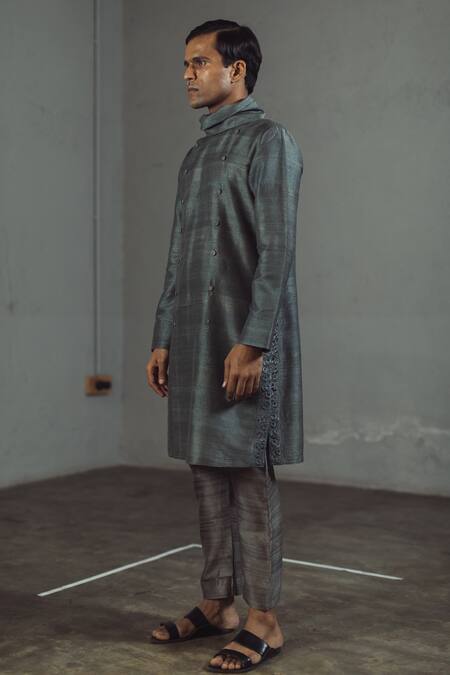 Grey kurta with cowl collar & double button placket & overlap detail.