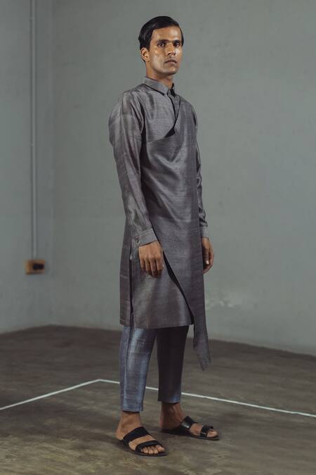 Buy_Mitesh Lodha_Grey Raw Silk Draped Kurta_at_Aza_Fashions