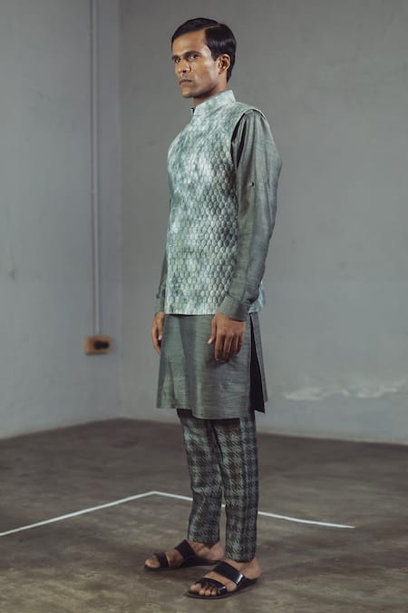 Grey Nehru jacket with band-collar & honeycomb embroidered motifs.