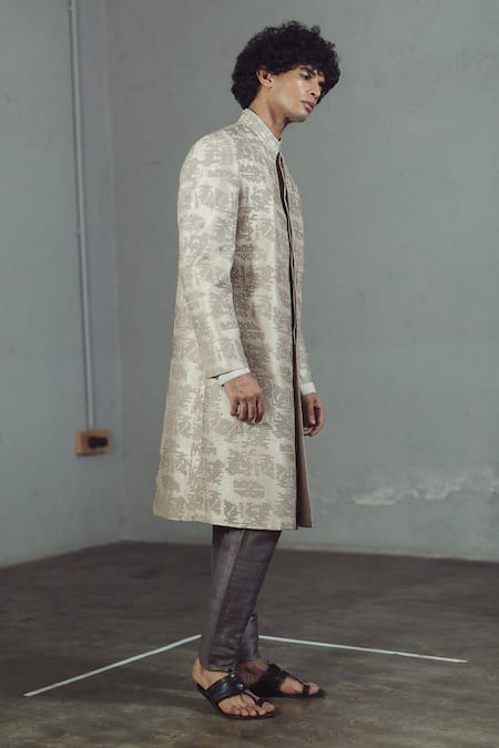 Grey sherwani with cross stitch embroidered motifs & mandarin collar.