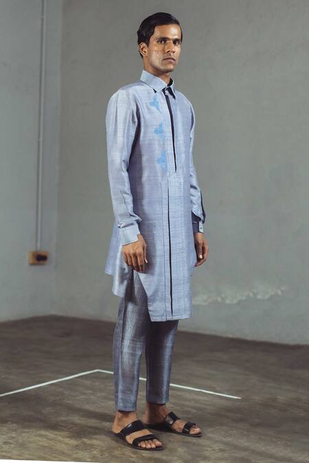 Grey kurta with moth embroidered motifs, overlap placket & asymmetric collar, cuffs.