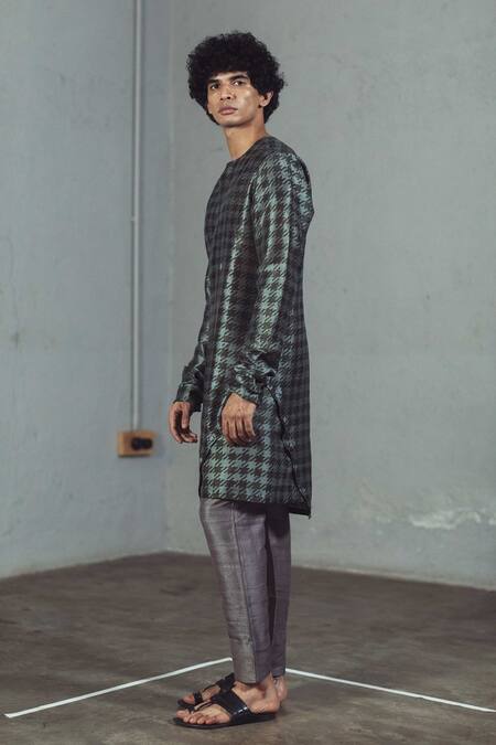 Grey kurta with houndstooth printed motifs, round-neck & asymmetric side button placket.