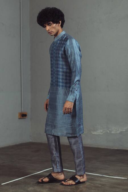 Buy_Mitesh Lodha_Grey Raw Silk Printed Kurta_at_Aza_Fashions