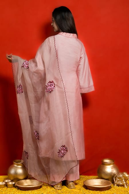 Baby pink silk kurta featuring resham thread work, bell sleeves, and side slits. Paired with straight fit pant and an organza dupatta with scalloped border and floral embroidery.