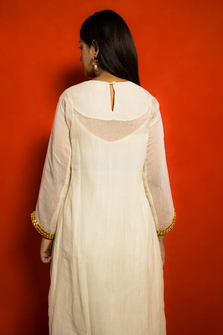 Buy_Mithi Supari_Ivory Malai Chanderi Embellished Mirror V Neck Yoke Kurta And Pant Set _Online_at_Aza_Fashions