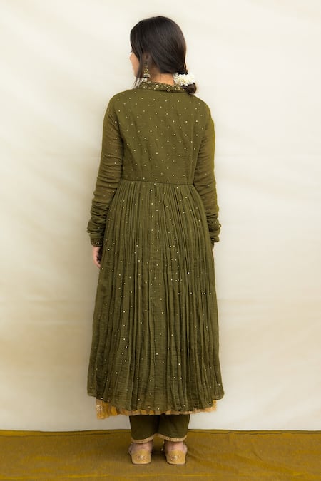 Olive green anarkali featuring zardosi hand embroidery and churidar sleeves. Paired with a matching pant and embroidered dupatta.