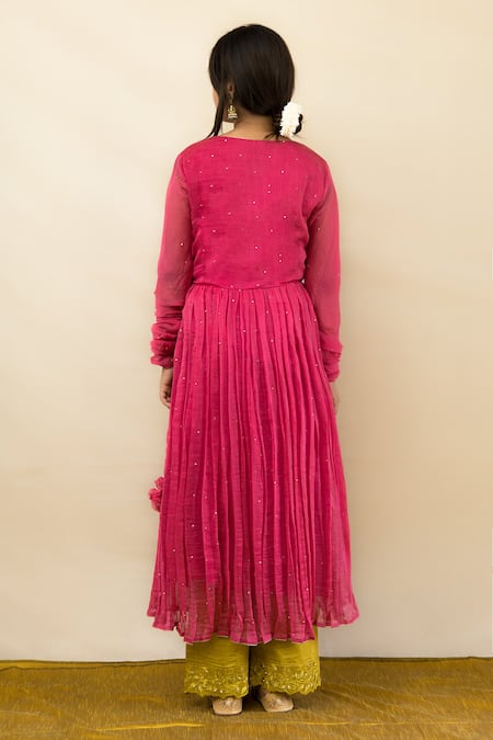 Pink mul chanderi angrakha anarkali featuring zari hand embroidered edges