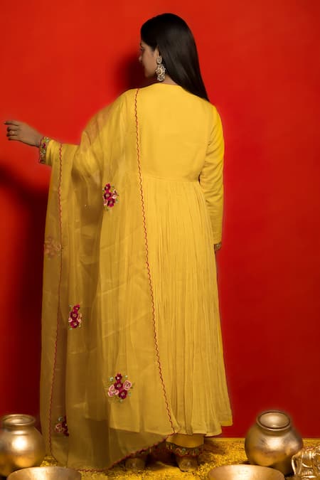 Yellow pure malai chanderi anarkali featuring pleated flare and floral pattern. Paired with straight fit pant and pure organza floral embroidered dupatta.