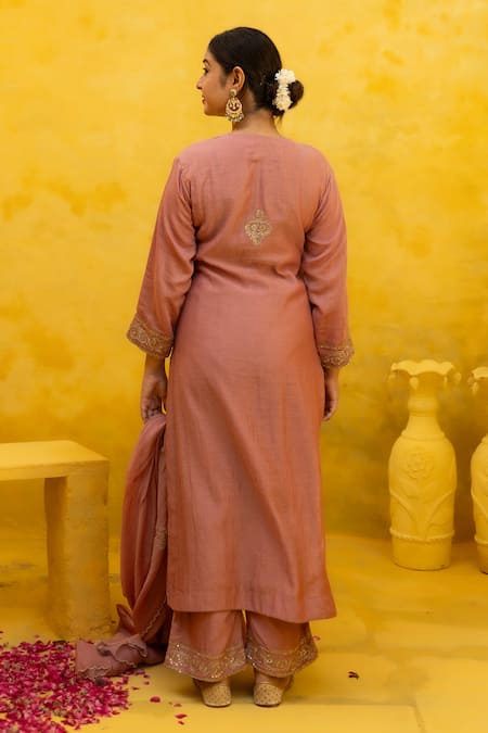 Pink kurta featuring zardozi embroidery on the neckline and sleeves. Paired with embroidered hem pant and scallop border dupatta.