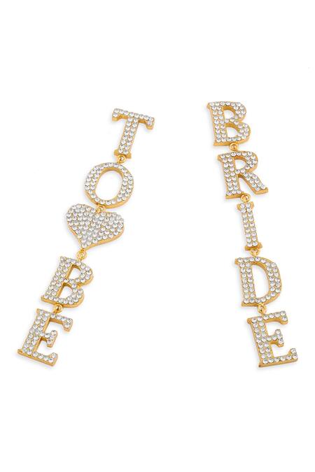 Gold dangler earrings shaped like 'Bride To Be' featuring rhinestone embellishments