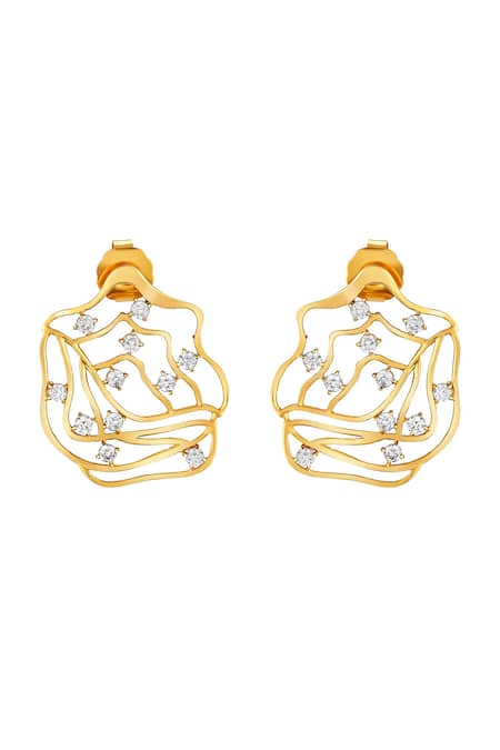 Gold stud earrings featuring a unique rose design embellished with cubic zirconia diamond stones