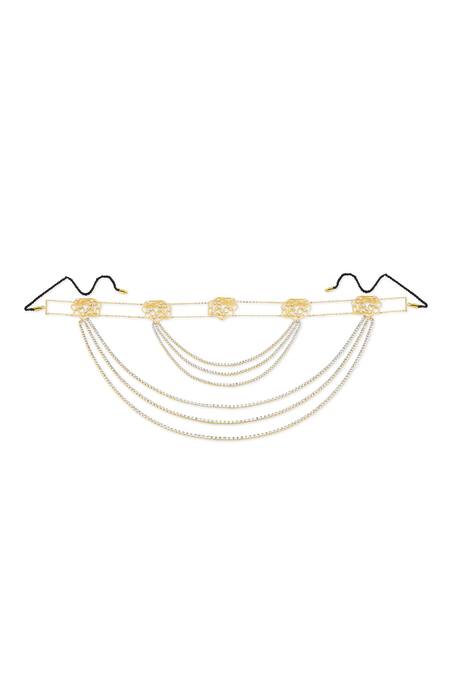 Gold layered mathapatti featuring cubic zirconia diamond embellishments