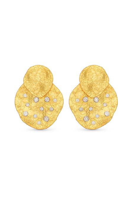 Gold textured stud earrings featuring cubic zirconia diamond embellishments