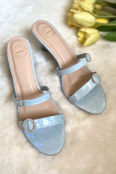 Blue open toe kitten heels featuring round and oval diamond buckles