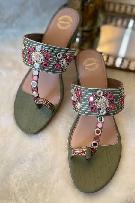 Green kolhapuri block heels featuring mirror embroidery and toe ring detailing