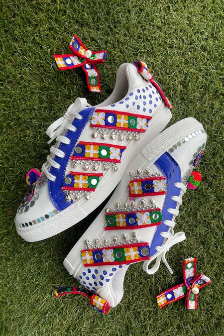 White and blue sneakers featuring white laces, ghunghroo embellishments, mirror work, and colorful embroidery.