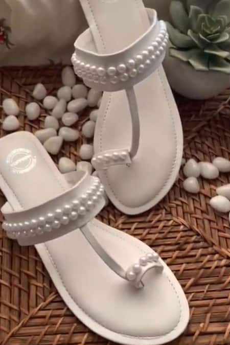 White kolhapuri flats featuring pearl embellishments and toe-ring detailing