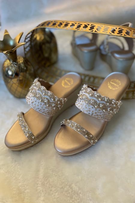 Beige wedges featuring scallop, pearl, and cutdana embroidery with open toe design