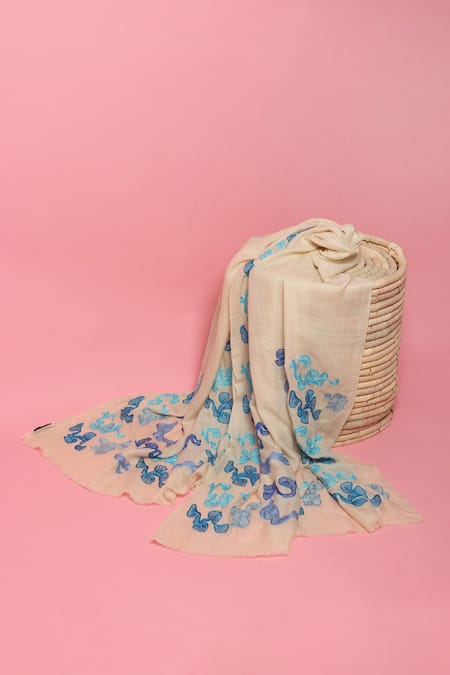 White pashmina shawl featuring abstract hand embroidery with frayed hem detailing