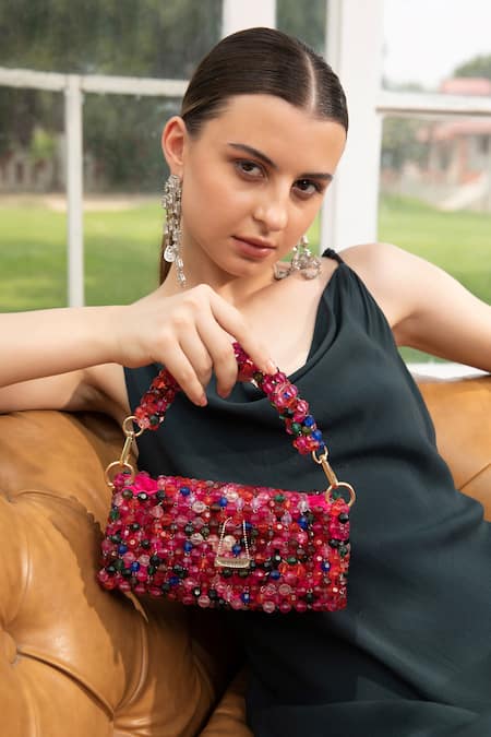 Short crystal handle for easy carrying, Magnetic closure for secure fastening, Vibrant crystal embellishments in multiple colors