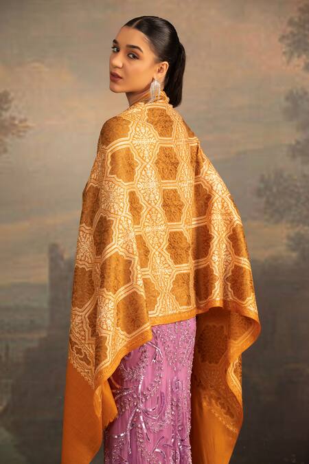 Mustard yellow shawl featuring dori embroidery in a floral pattern
