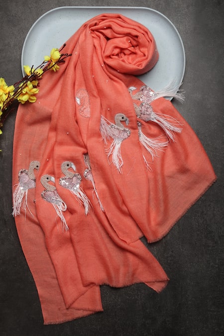 Buy_Modarta_Peach Feather Bird Embellished Pashmina Shawl