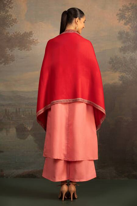 Red shawl featuring a floral thread embroidered border