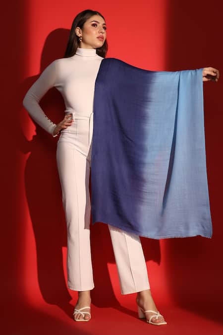 Blue ombre shawl crafted from fine wool featuring a fringe tassel border