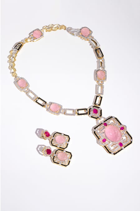 Large central pendant with intricate stone work, Matching earrings with pink stone accents, Swarovski crystal detailing enhancing elegance