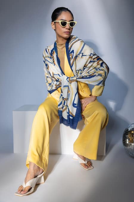Multicolor shawl featuring nautical stripe, rope, and chain prints with fringe tassel border