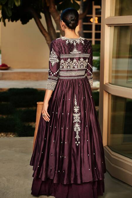Wine flared lehenga paired with mirror embroidered blouse. Comes with jacket with resham aari, zardozi and sequins work.