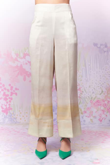 Ivory Pure Chanderi Silk Printed Landscape After Glow Rosette Trousers