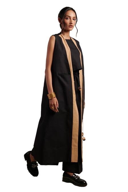 Black trouser set featuring a sleeveless top with an open neckline. Accompanied by a long overlay jacket with drawstring detailing.