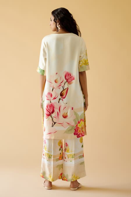 White kurta featuring a notched neck and half sleeves with a vibrant floral print. Paired with floral print pants that complement the kurta design.