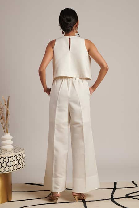Off white cropped top featuring a round neckline and sleeveless design. Paired with straight-fit trousers that have drawstring detailing.
