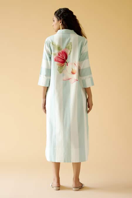 White and light blue midi dress featuring a collared neck and three quarter sleeves