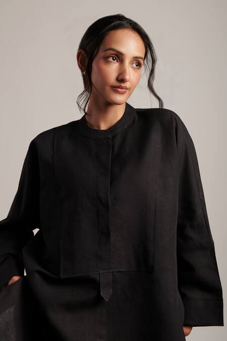Black tunic made from 100% pure linen featuring a round collar and full sleeves