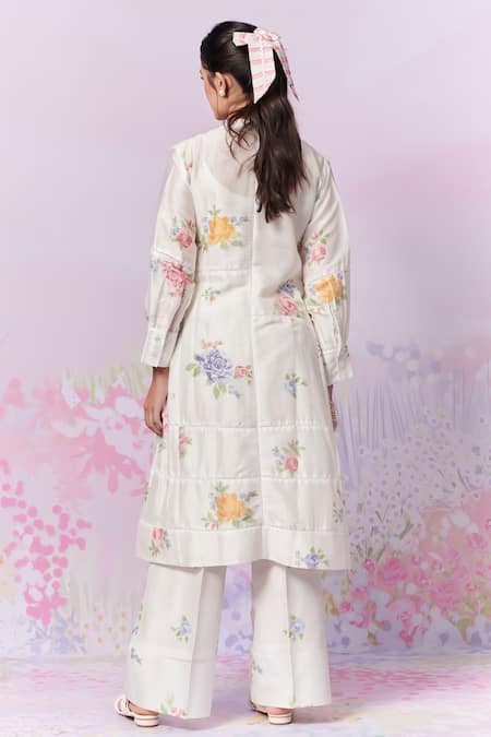 Ivory straight kurta featuring multi-color cross-stitched rose embroidery. Comes with an inner for added comfort.