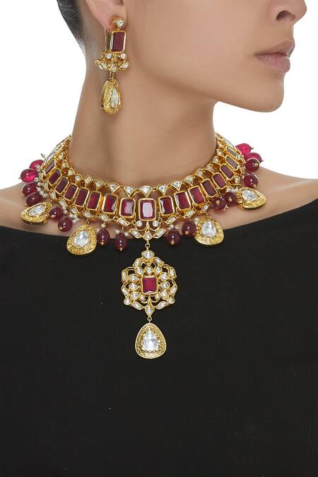 Buy_Moh-Maya By Disha Khatri_Pink Artificial Stones Adjustible Necklace And Earrings Set_Online_at_Aza_Fashions