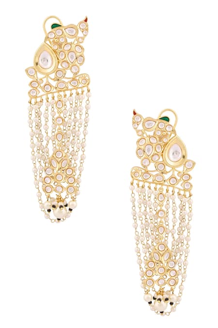 Gold plated dangler earrings featuring intricate kundan embellishments and cascading pearl chains