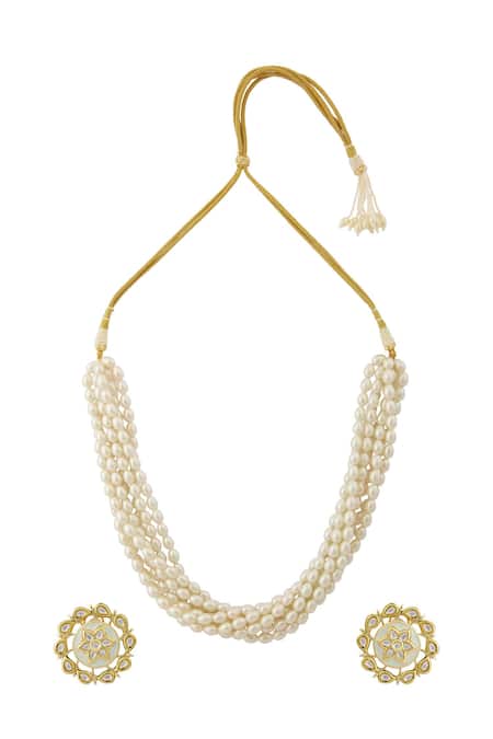 Gold-tone necklace featuring seven-line multi-pearl strings. Paired with kundan encrusted floral studs.