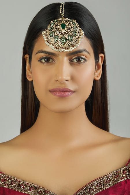 Gold plated maangtikka featuring embellished beads and a semi-precious stone centerpiece