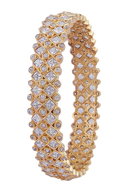 Gold plated bangles embellished with crystals. This set includes two intricately designed bangles made from a mixed metal alloy of brass and copper.