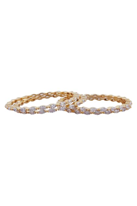 Gold plated bangles featuring crystal embellishments. Set includes four bangles crafted from a mixed metal alloy of brass and copper.